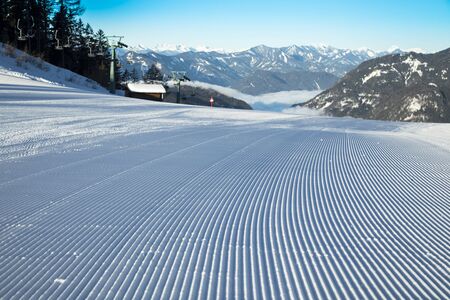 Prepared snowcat track at alpine skiing resort on a sunny day
