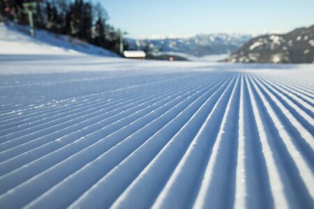 Fresh snow groomer tracks on a mountain ski piste