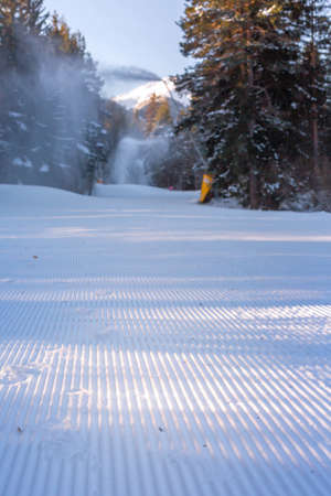 Close-up perspective of freshly groomed ski run slope and defocused forest, Bansko, Bulgaria