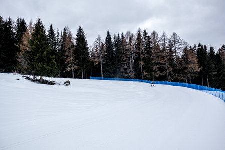 A ski trail with an orange fence grid against a backdrop of snowy cliffs and low-hanging clouds. Above is a blue sky. A lone skier glides down the piste. Winter sports during the vacations