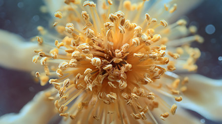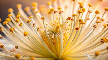 Delicate stamen and filaments of a flower dusted with fine pollen grains, showcasing intricate details against a soft, gentle, and creamy blurred background.