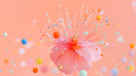 A vibrant pink flower with long, colorful stamens surrounded by floating pastel spheres and bubbles against a soft peach background.
