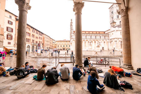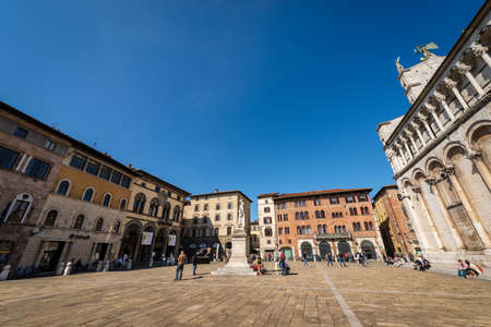 LUCCA, ITALY - APRIL 16, 2017: Piazza San Michele (Town square) with the Church (San Michele in Foro) and the medieval palaces. Lucca, Tuscany, Italy, Europe