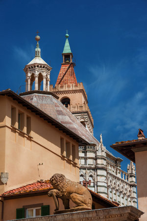 Pistoia beautiful landmarks. Medieval bell tower and gothic Saint John Baptistry in the historic city center, seen from Sala Square with old Lion's Well