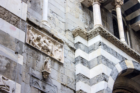 Lucca, Italy-February 16, 2025:Artistic motifs of the Cathedral of San Martino in Lucca on a cloudy day