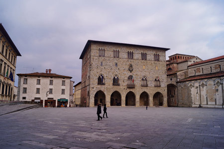 Pistoia, Tuscany, Italy - May 2020: Piazza Duomo, the setting (in July) of the Giostra dell'Orso (Bear Joust) with Cathedral of San Zeno, Palazzo del Comune, Palazzo del Podesta and baptistery