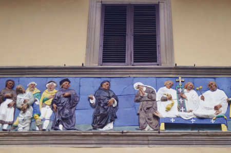 Detail of portal frieze of the Ospedale del Ceppo, Pistoia, Italy