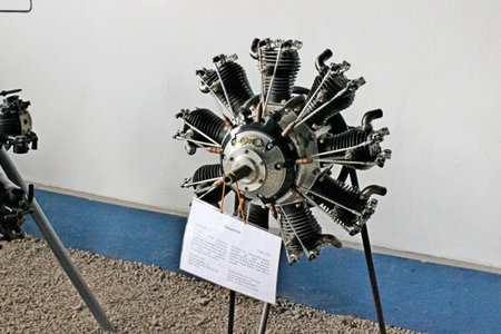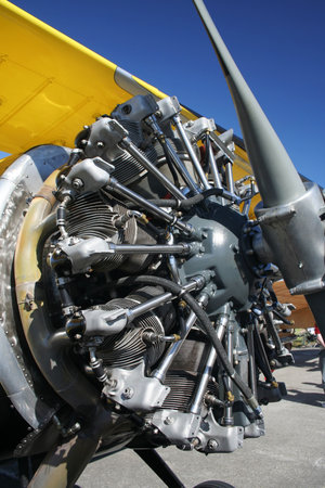 fragment of an radial aircraft reciprocating engine, partially blurred background