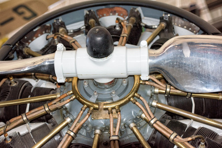 Old mechanic plane engine, historic retro radial motor part with closeup details