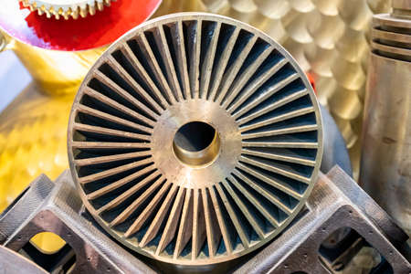 Close up industrial casting parts vane pump or propeller blades gold color or brass