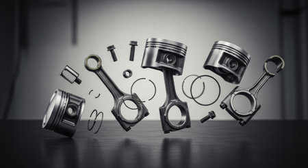 Automotive engine components including pistons, connecting rods, piston rings, and bolts, meticulously arranged in a studio setting.