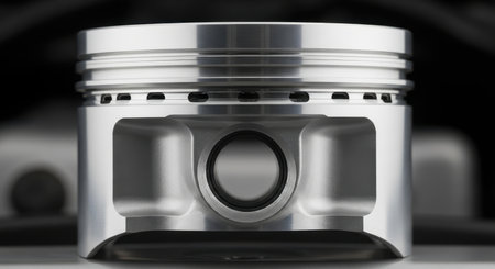 Polished aluminum engine piston, showcasing its smooth, reflective surface and intricate grooves. essential component for internal combustion engines, symbolizing power and precision.