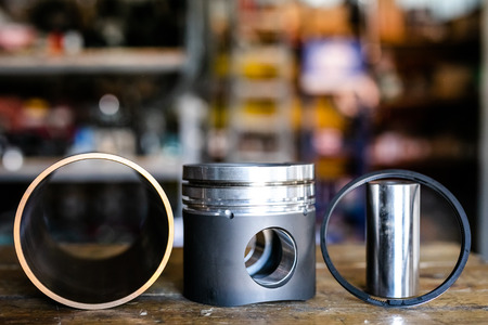 The connecting rod, piston and cylinder block in a disassembled condition in a car workshop.