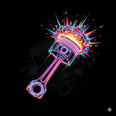 A black t-shirt features a vibrant, neon-glowing illustration of an engine piston with connecting rod, surrounded by sparks. This graphic design is perfect for automotive and racing enthusiasts. High quality photo