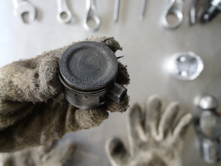 Old piston of an internal combustion on the tools background.