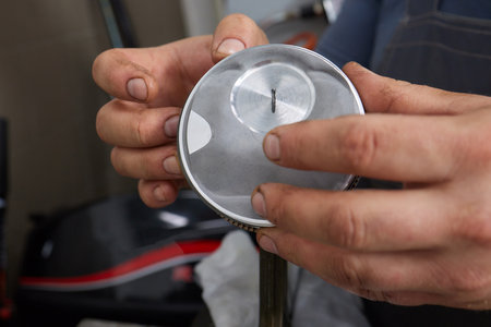Engine cylinder in the hands of a mechanic. Auto engine repair services.