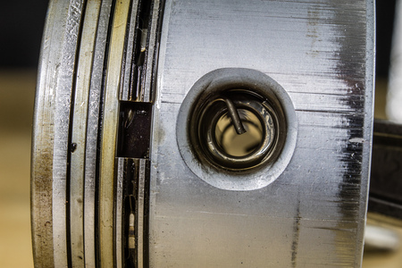 Close-up of piston and rings on the connecting rod. Details of the car. Internal combustion engine.