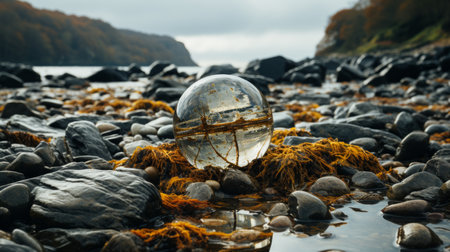 a glass ball sitting on a rocky beach