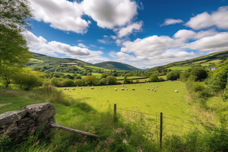 rollinf countryside hills with a clear blue sky, surrounded by fluffy clouds, created with generative ai