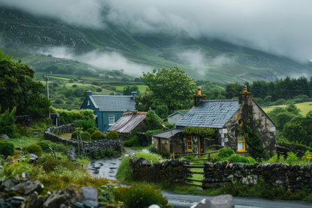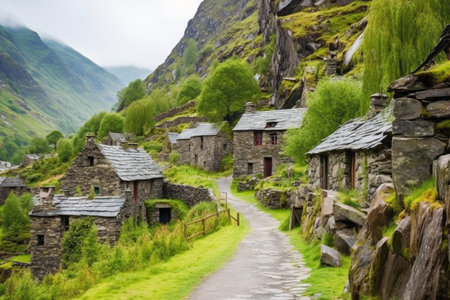 rustic stone cottages lined along a rugged mountain path, created with generative ai