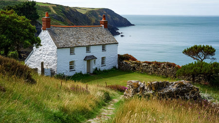 Remote white cottage nestled on a green hillside by a stone wall, watching the peaceful blue sea and distant cliffs