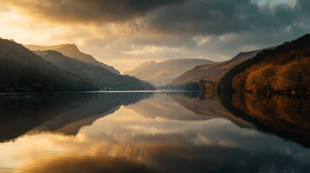 A breathtaking sunset over a calm lake reflects majestic mountains and lush forests, creating a tranquil atmosphere ideal for nature lovers and explorers.