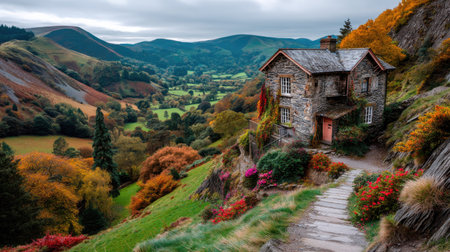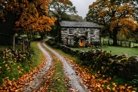 A charming stone cottage nestled in a rural landscape, surrounded by vivid autumn leaves on a winding dirt path. tall trees frame the scene, showcasing the serene beauty of an idyllic countryside setting. Generative AI
