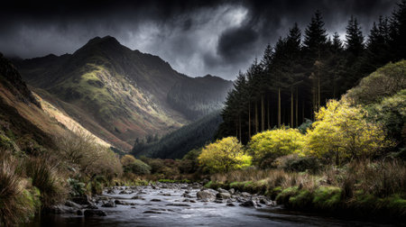 A breathtaking landscape of a wild river in a deep valley. Dark, stormy clouds loom over mountains and a dense forest, with sunlight highlighting autumn foliage.
