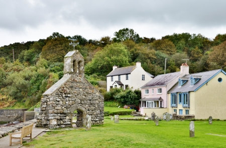 St Brynach s Church; a12th century religious site, with traditional cottages, on the Dinas Head Peninsula at Cwm-yr-Eglwys, Pembrokeshire