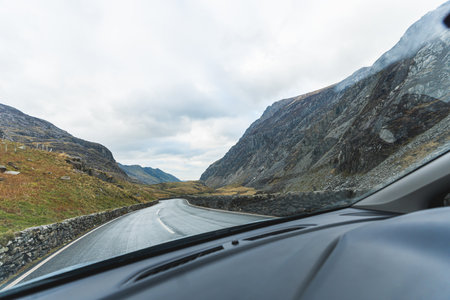 travelling in Snowdonia National Park by a car, cold and cloudy day, Wales. High quality photo
