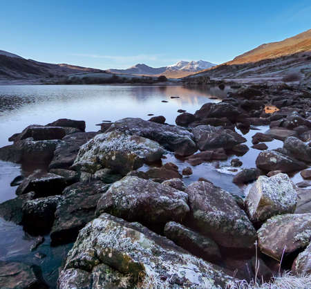 An almost cloudless sky on a Winters' morning gives a stunning view across the Welsh lake, Lynnau Mymbyr, just outside of Capel Curig. Beyond the rock strewn shoreline and across the lake Snowdon sits at the top of the Snowdon Horseshoe