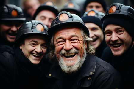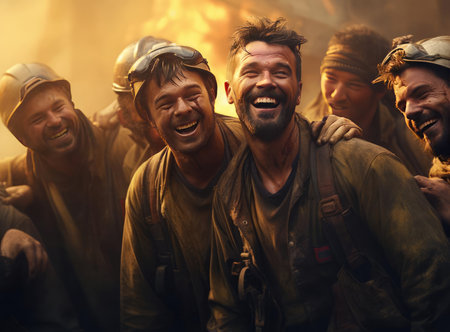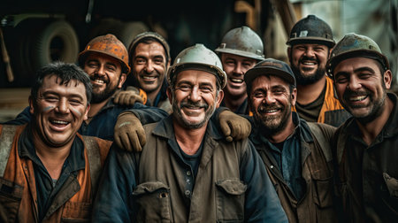 A diverse group of construction workers is smiling and collaborating effectively, showing teamwork in their tasks