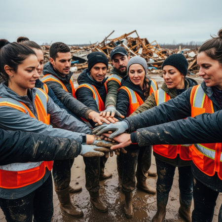 A low-angle, medium shot captures a diverse group of volunteers huddling closely, their hands stacked together in the center as a symbol of unity and teamwork. The group, consisting of both men and women, is dressed in practical work attire including high-visibility orange vests, dark jackets, and gloves. Their clothing and boots are covered in mud, suggesting recent physical labor in a challenging environment. In the background, a large pile of wooden debris and rubble indicates the setting is a disaster relief area or a clean-up site. The expressions on their faces are focused and determined, highlighting their commitment to a common goal.