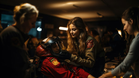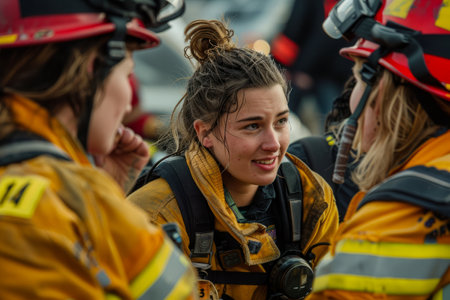 A group of female firefighters debriefing after a challenging rescue mission, their camaraderie and solidarity evident as they reflect on their experiences and support one another in processing the emotional toll of their work.