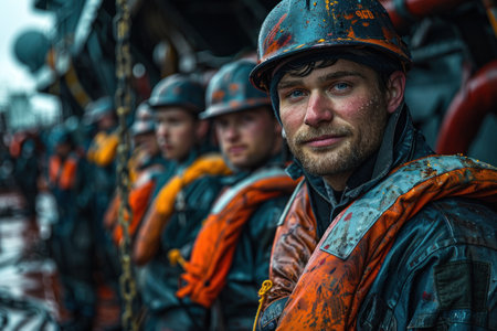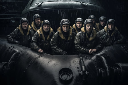 Submarine crew men standing on deck of the ship and looking at camera. Important mission for brave people. Generative AI