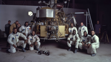 A close-up portrait of an astronaut with a team. Exploration of outer space and new planets.