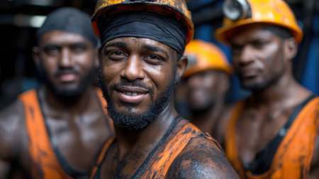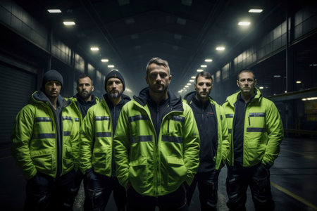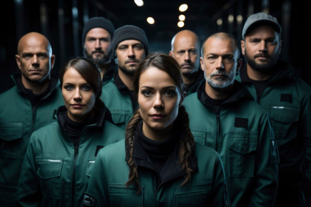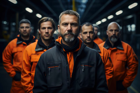 Portrait of a group of workers in a factory smiling and looking at the camera, group of smiling construction workers wearing uniforms, AI Generated