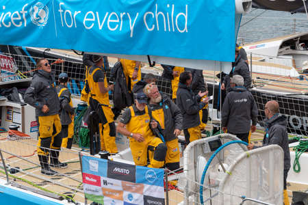 Cape Town, South Africa. 2019. Clipper 70 racing yachts on the quay at Victoria Basin V&A Waterfront, Cape Town. Crew of For Every Child boat on the quay.