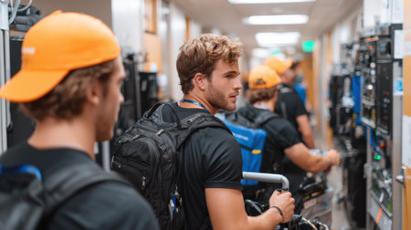 A group of men wearing orange hats and backpacks are walking down a hallway. They are carrying backpacks and a cart
