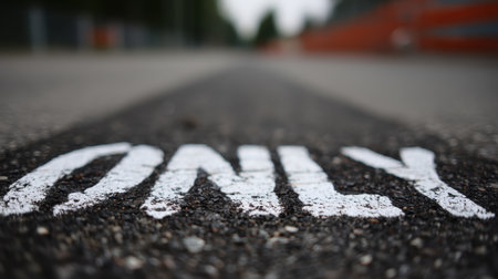 This close-up image captures the word ONLY painted in white on a textured asphalt surface, emphasizing road markings. The blurred background provides an urban context, highlighting the significance of directional signs in everyday life.
