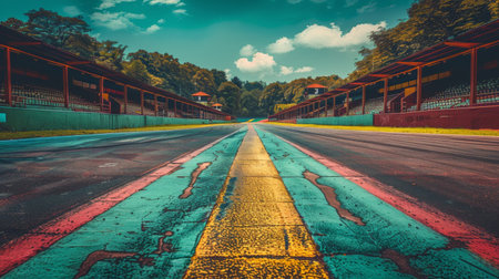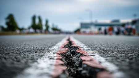 Capture the essence of speed with this close-up image of a race track's starting line, showcasing the asphalt texture and inviting atmospheric perspective.