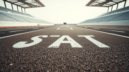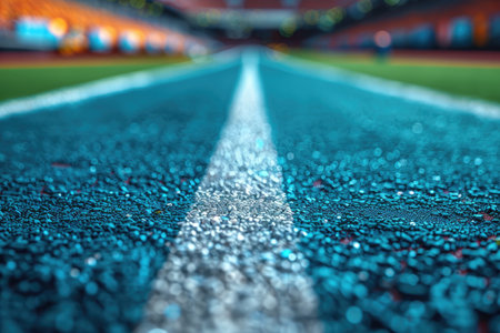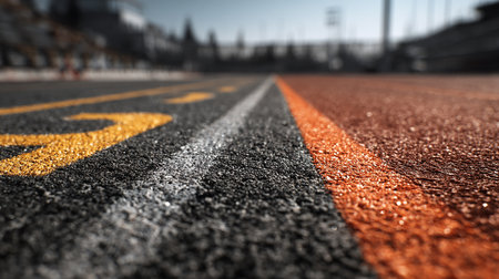 Close-up of a running track in a stadium with white striped markings. Generative AI