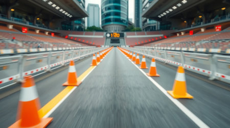 A stunning view of an empty modern stadium, capturing the essence of architectural beauty, dramatic lighting, and vibrant track lines, perfect for sports imagery.