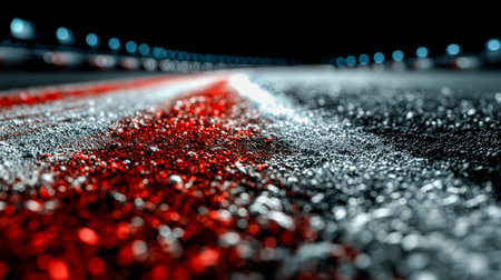 This close-up shot captures the vibrant colors of a racing track at dusk, featuring bold red and white stripes on a textured asphalt surface under stadium lights.