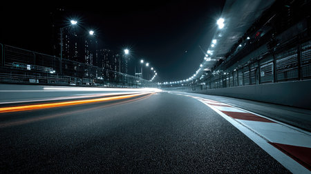 This captivating night image captures a race track illuminated by bright lights, showcasing dynamic light trails from speeding cars and the vibrant atmosphere of motorsports.