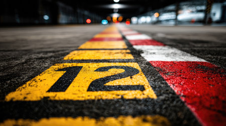 A striking close-up capture of the race track starting line featuring the number twelve. The urban setting showcases an industrial parking environment, highlighting vibrant colors and detailed textures in an empty area, symbolizing speed and competition.