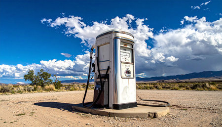 Colorful vintage gas pumps stand in a row against an urban backdrop at night, with reflections capturing the vibrant scene. An atmospheric setting blends retro design with modern city elements.
