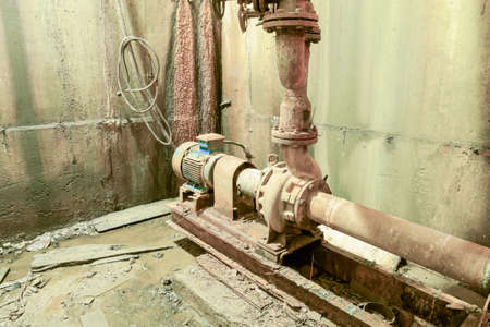 Basement of a water pumping station. Abandoned post-apocalyptic view of the basement pumping rooms. Old rusty pump in the basement.
