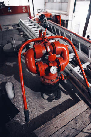 Industrial interior of water pump with valves, pressure gauges, motors inside vintage engine room. Urban powerful pipelines and pumps indoors. Concept of automatic control systems. Copy ad text space
