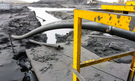 Heavy machinery extracts thick tar from a muddy pit during daylight hours. Generative AI